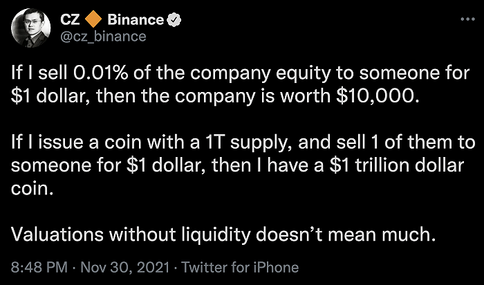 不過,11月30日,趙長鵬在社交媒體發布信息稱,如果將公司權益的0.01%以1美元賣出,是否公司就值1萬美元;如果發行1萬億總量的貨幣,並以1美元售出一個代幣,是否他就有1萬億美元價值的幣。並在其後評論,沒有流動性的估值不意味什麼。疑似回應有關登頂華人新首富身價900億美元的熱搜。