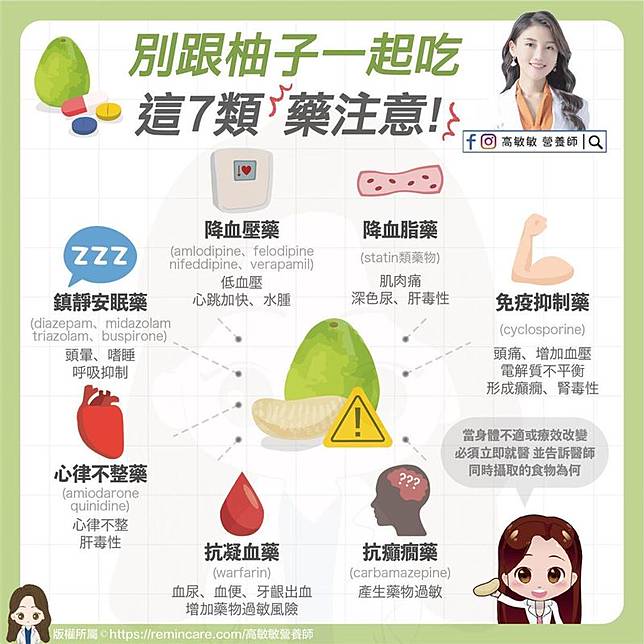 事實上,像是營養師高敏敏也指出,柚子雖然營養價值高,又含膳食纖維能夠幫助排便,不過若有在服用降血壓藥、降血脂藥、免疫抑制藥、抗癲癇藥、抗凝血藥、心律不整藥、鎮靜安眠藥等7類藥物的人,要避免與柚子一起食用;另外,患有糖尿病、腎臟疾病、易胃食道逆流者,也需要特別注意。